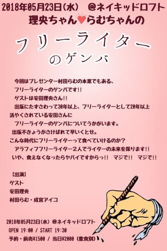 今度の水曜日、ネイキッドロフトでの「村田らむプレゼンツゲンバシュギ第17回」に出演します。題して「理央ちゃん・らむちゃんのフリーライターのゲンバ!!」。 (名前だけは)可愛いライター二人が、フリーライターという「仕事の現場」について話します。僕…